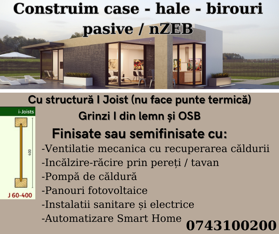 Cauți o locuință eficientă, cu facturi reduse și confort optim? Îți oferim case pasive, pompe de căldură, sisteme fotovoltaice și climatizare inteligentă, pentru un consum minim și un trai modern. Încălzirea prin pardoseală, pereți sau tavan asigură confort termic de excepție, iar tehnologiile sustenabile te aduc mai aproape de un viitor economic și eco-friendly!